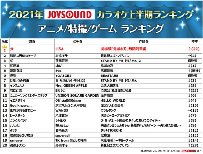 【悲報】残酷な天使のテーゼ、鬼滅の影響で「カラオケランキング1位」から陥落していた…